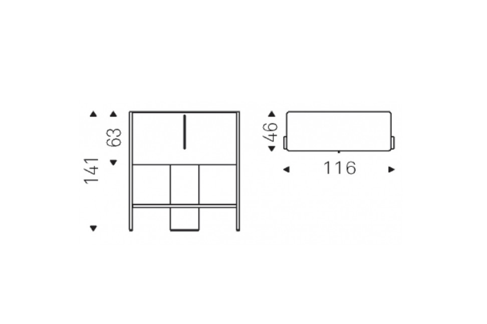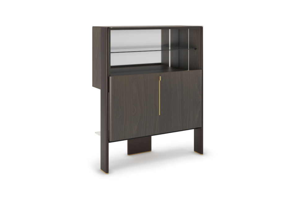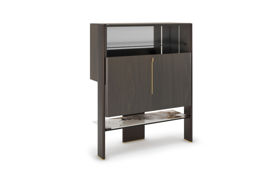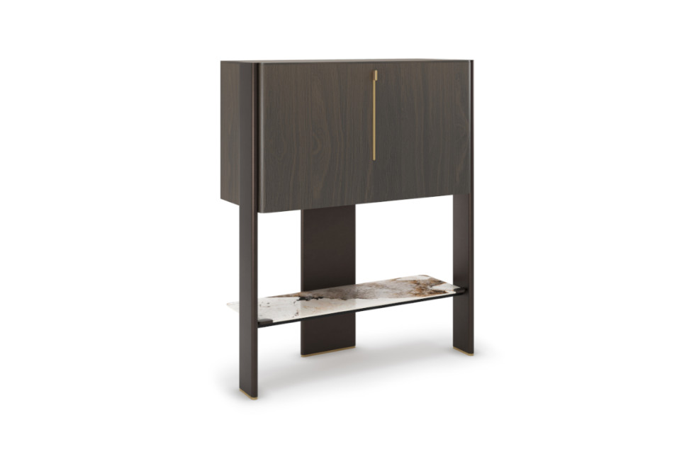 La madia Cremona di Tosca Design per Cattelan Italia, costituisce un'elegante fusione tra legno e ceramica. I designer hanno sfidato le convenzioni classiche della progettazione, rompendo la regola secondo cui gli elementi più pesanti dovrebbero essere posizionati in basso. Invece, il corpo principale in legno è posto nella parte superiore, sopra un ripiano a giorno. Questa disposizione crea uno spazio aperto che sembra far fluttuare con leggiadria il contenitore, nonostante la sua apparenza robusta. La caratteristica principale di questa moderna madia in legno è il meccanismo di apertura. L'anta scorre verticalmente, permettendo di chiudere o aprire una sezione del mobile alla volta. Può anche essere lasciata abbassata per invertire la parte aperta con quella chiusa, offrendo così la possibilità di utilizzare Cremona come un raffinato mobile bar di design. Il corpo della madia, realizzato in pregiato legno, è sorretto da tre gambe dagli spigoli smussati. La peculiarità risiede nella funzione avvolgente delle gambe, che accompagnano il cassone fino alla parte più alta e diventano un elemento decorativo di grande presenza. Alla base, un sottile bordo in acciaio color ottone si abbina alla maniglia decorativa al centro dell'anta scorrevole, evidenziandosi con intensità sul fondo scuro.