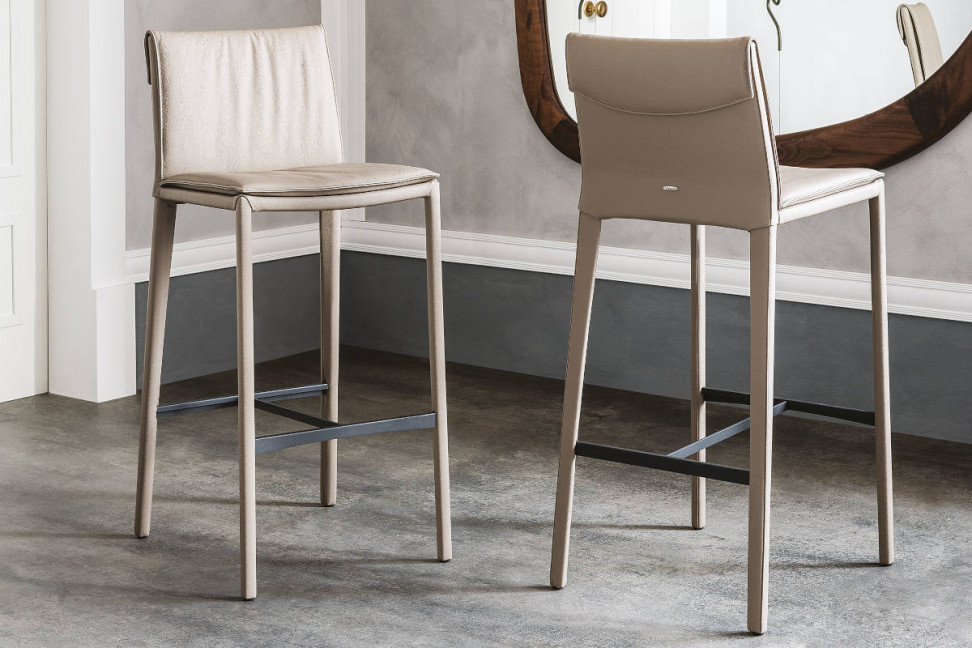 Lo sgabello "Isabel", concepito da Paolo Cattelan per l'azienda omonima, incarna una soluzione ideale per l'ambiente living, grazie alla sua ergonomia e al comfort offerto dai cuscini rivestiti. Questi cuscini, combinati con un'estetica discreta, sottolineano la parola d'ordine: comodità. Il sottile cuscino sembra avvolgere delicatamente la seduta, conferendo un senso di accoglienza e avvolgimento anche allo schienale. Questo design è disponibile anche nella variante con schienale alto.
