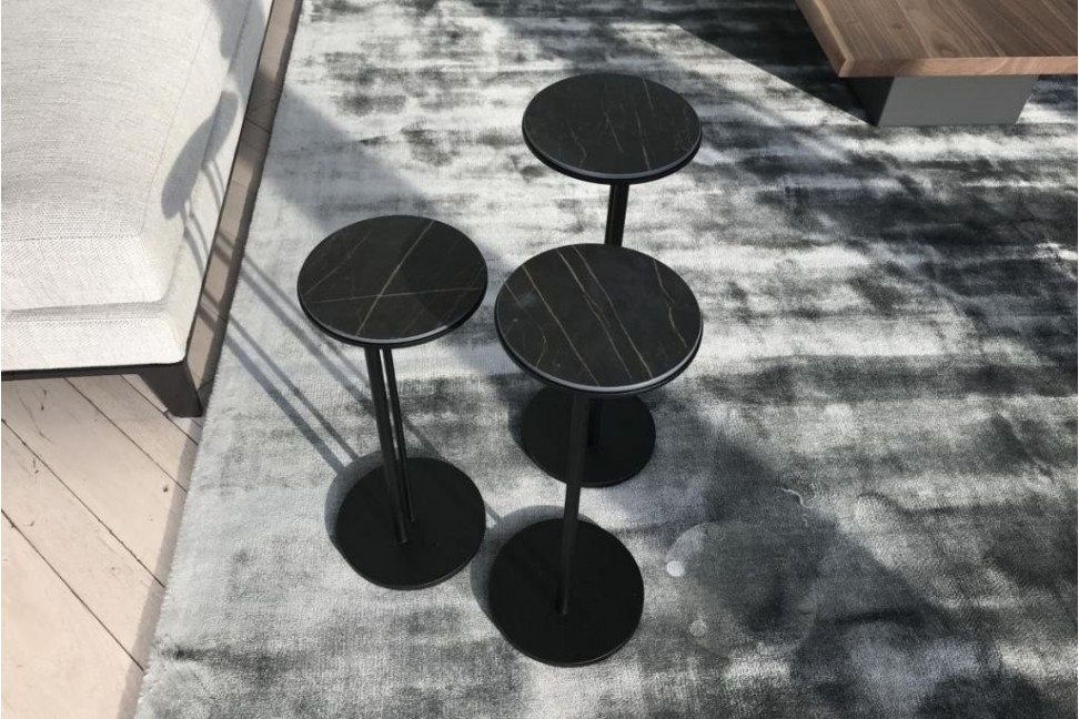 Set composto da n.3 tavolini con base in acciaio verniciato goffrato color nero e piano rotondo in marmo ceramica Portoro opaco.