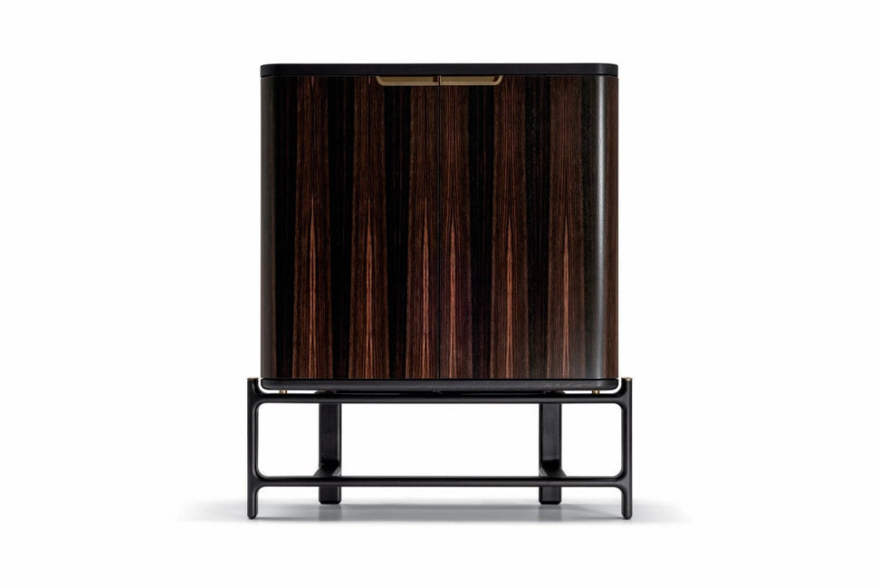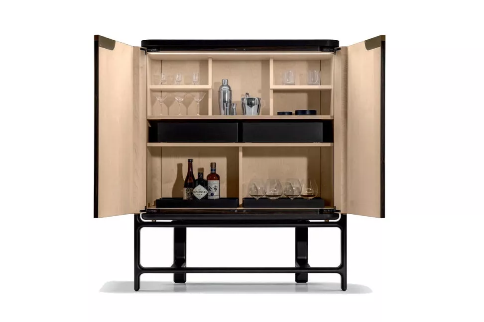 Caratteristiche comuni delle due versioni, sono la parte interna rifinita in acero e le maniglie in metallo verniciato con finitura bronzo sfumato, il piano superiore che è disponibile in marmo, vetro retroverniciato o impiallacciato in frassino della stessa finitura della struttura. I piedini regolabili che garantiscono la stabilità del mobile su qualsiasi superficie ed in fine una luce LED con accensione all'apertura.