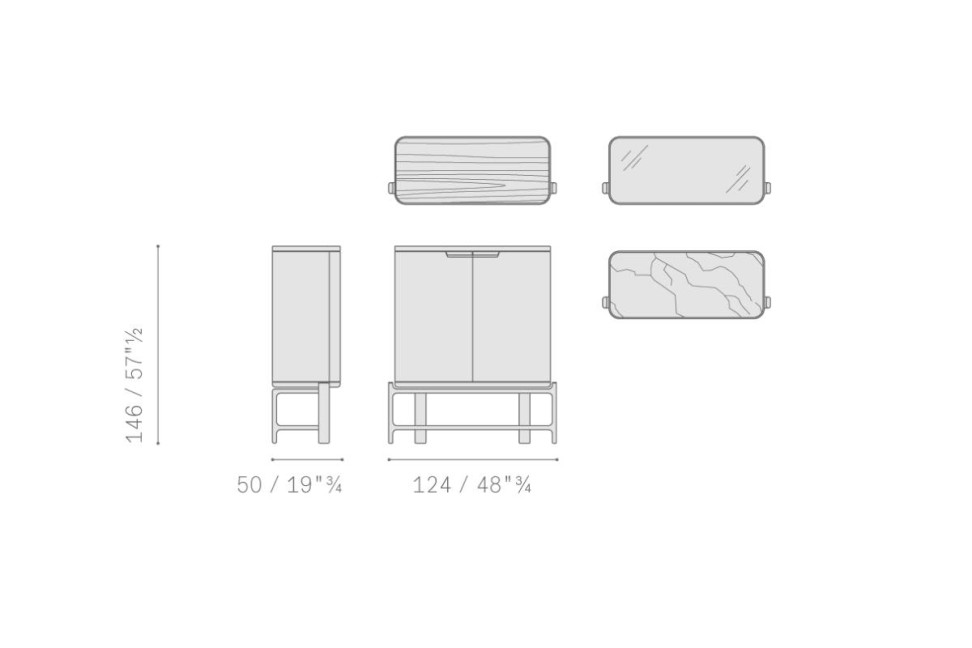 A differenziare le due versioni della credenza Duo sono i cassetti interni con fondo rivestito in pelle (su richiesta), divisori e vassoi disponibili solo per la versione alta, mentre solo nella versione bassa il vano centrale è costituito da un cestello che può contenere un cassetto e, su richiesta, può essere accessoriato con portabottiglie.