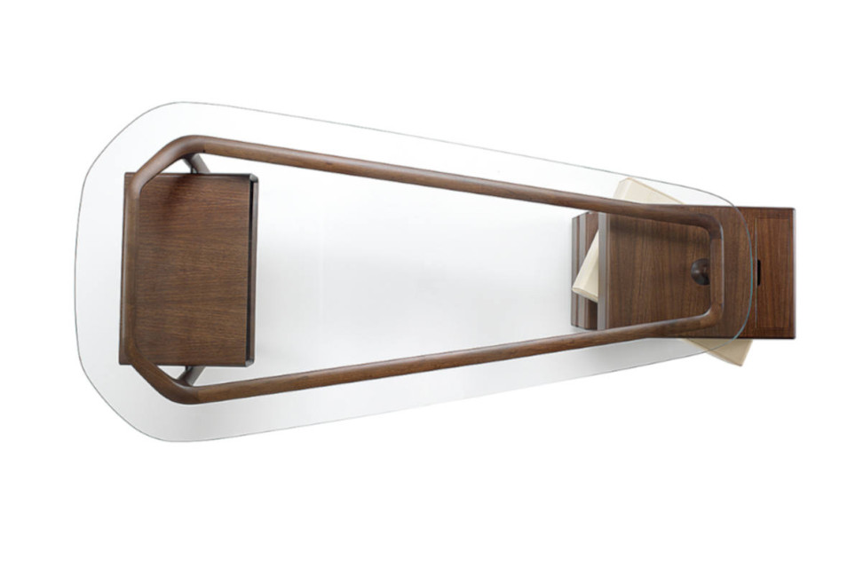 La cura dei dettagli, elemento distintivo dell'azienda italiana, si esprime al massimo nella realizzazione di questa scrivania. Ceccotti Collezioni realizza la struttura della scrivania in massello di noce americano, ed arricchisce la cassettiera, che funge da gamba, giocando con varie tipologie di legno: tre cassetti sono in noce, ed uno girevole in acero. L'architetto Noè Duchaufour-Lawrence ha realizzato questa scrivania con un utile vano laterale portaoggetti in noce. Ceccotti Collezioni realizza il piano della scrivania Omaggio in vetro temperato extrachiaro, fumé o madras, già predisposto per il passaggio dei cavi.