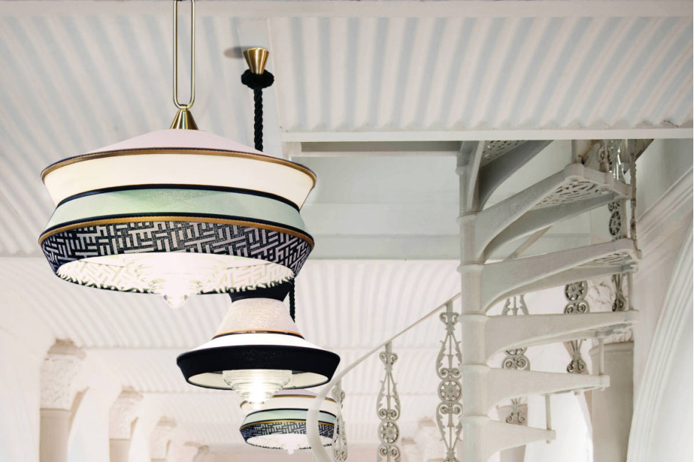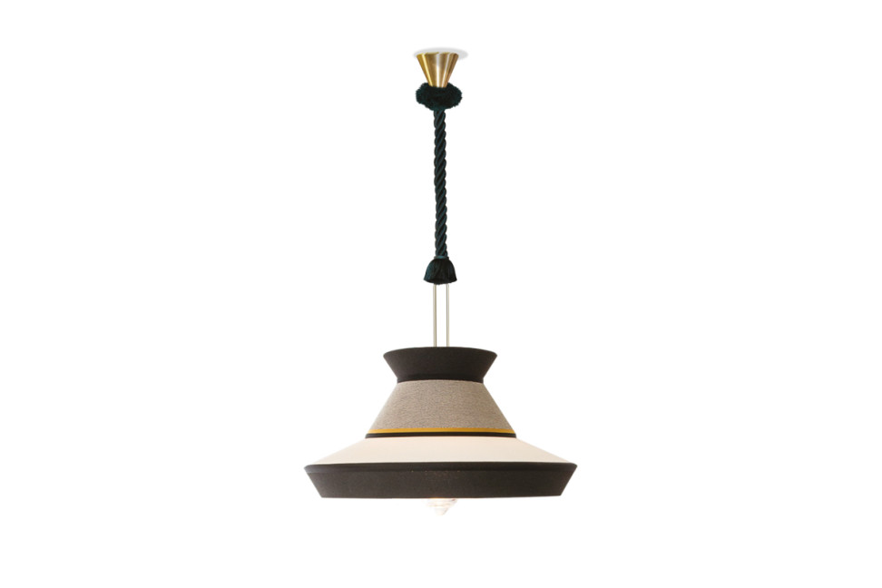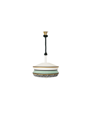 La lampada Calypso ideata da Servomuto per Contardi, sembra essere presa direttamente dagli anni '40 e rivisitata in chiave moderna: si parte infatti da un paralume classico che viene combinato con tessuti dalle geometrie e dai colori vivaci. Il risultato è una lampada a sospensione che colpisce l'attenzione grazie al suo design contemporaneo ed inusuale. Calypso si presenta con una struttura in ottone spazzolato ed un diffusore in vetro trasparente; il paralume invece è disponibile in varie finiture in modo da soddisfare qualsiasi tipo di esigenza.