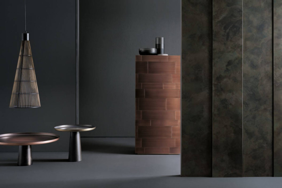 Da quattro generazioni l'azienda italiana De Castelli si è specializzata nella lavorazione dei metalli, dando vita ad una collezione unica. Il contenitore Celato del centro R&D De Castelli, si presentata con una forma compatta e solenne, un volume rivestito in metallo che nasconde tanti cassetti interni, che si aprono con una lieve pressione della mano. La struttura e gli interni sono realizzati in legno di betulla, e il rivestimento in metallo, come una corazza, avvolge e dona carattere a questo elemento di arredo. Il contenitore Celato è disponibile in tre dimensioni, con rivestimento in rame, ferro, ottone e corten.