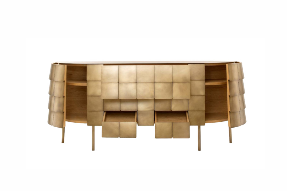 Il contenitore Yoroi all'apparenza si presenta compatto e impenetrabile, in realtà l'interno è finemente rivestito in legno e nasconde una serie di pratici spazi per tutte le esigenze: due cassetti con apertura inclinata, un ampio cassetto frontale e due ante laterali curve.