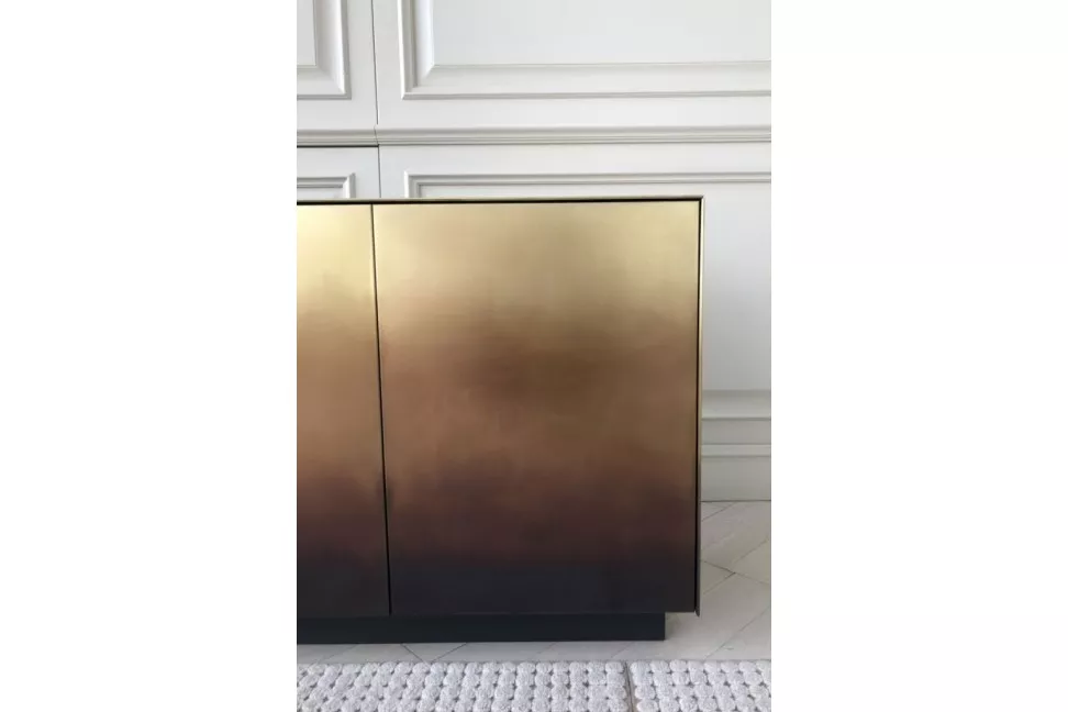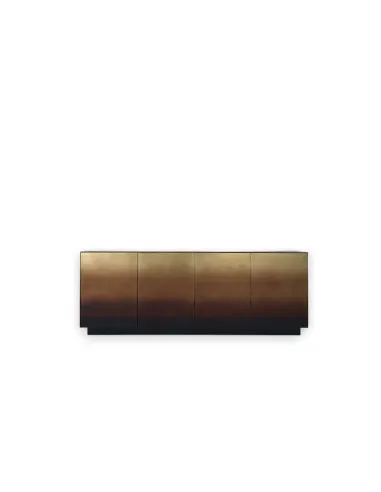 La madia Marea in offerta expo nel nostro showroom, presenta una struttura in ottone con finitura DeMarea con un ripiano interno in rovere finitura titanio.