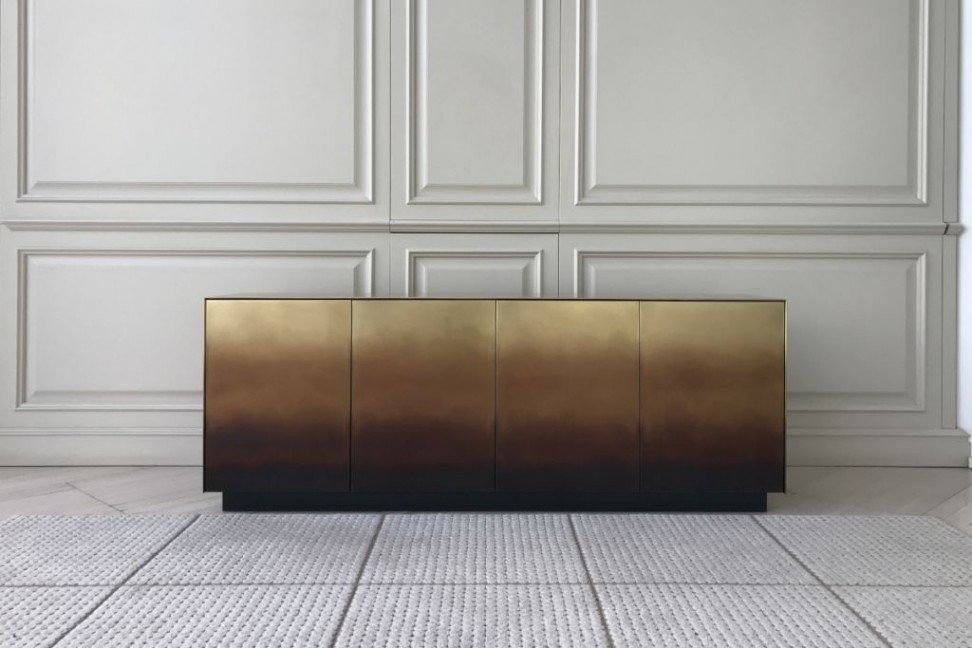 Grazie ad una particolare lavorazione a mano che prevede varie ossidazioni, la superficie in metallo di questo mobile contenitore sembra ricordare l'effetto dell'erosione dell'acqua sul materiale.