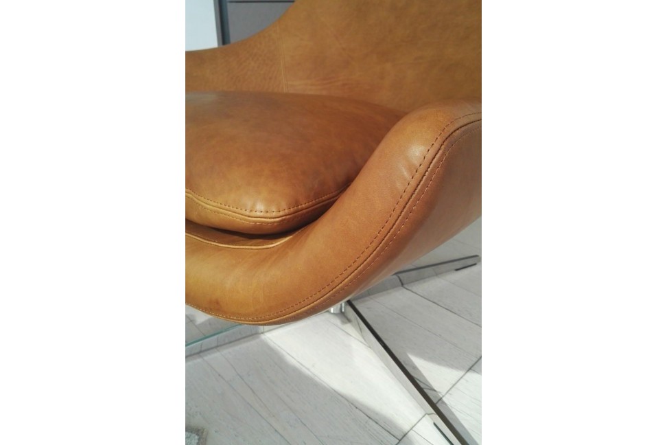La poltrona Ego, in offerta expo nel nostro showroom, è un complemento d'arredo che si presta ad arredare ambienti moderni scaldandone l'atmosfera con il particolare rivestimento in pelle color cognac risaltato dalla base in metallo cromato lucido. Un comodo pouf, abbinato alla poltrona, contribuisce ad amplificare il comfort della seduta.