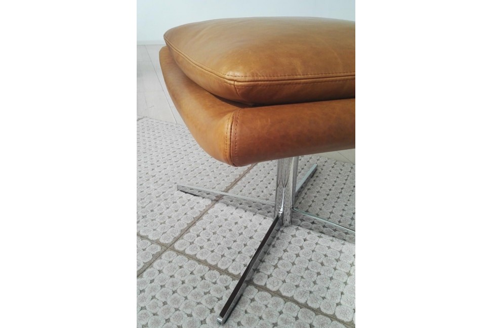 Rivestimento in pelle color congac e base in metallo cromato lucido, girevole per la poltrona e fissa per il pouf.