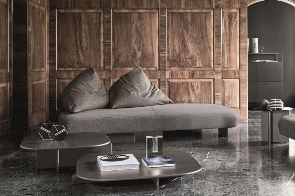 Gli schienali e i cuscini, appoggiati a contrasto su delle basi geometriche, non sembrano tener conto di un fronte e di un retro divano, perchè questi ultimi sono a libera interpretazione di chi sceglie di vivere l' area giorno in base al proprio gusto e alla propria immaginazione.