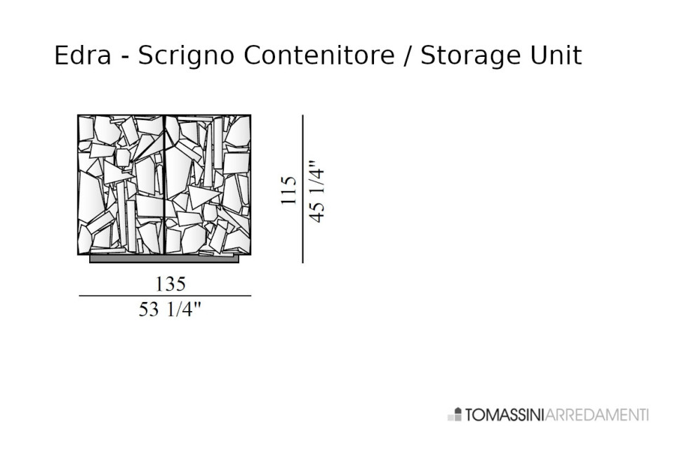 Le superfici esterne dello Scrigno sono un vero spettacolo per gli occhi, composte da un mosaico di schegge di specchio, donano al mobile una dimensione artistica, trasformandolo in una scultura luminosa e affascinante. La luce si riflette sulle superfici, creando giochi di riflessi e illuminando l'ambiente circostante. La struttura interna è studiata per garantire resistenza e durabilità nel tempo ed è realizzata in legno laccato, arricchito da speciali vernici metallizzate che si abbinano perfettamente al rivestimento esterno. Questa sinergia di colori crea un'armonia visiva, conferendo al mobile un aspetto omogeneo e sofisticato. I cassetti e le ante si aprono e si chiudono con fluidità, offrendo un facile accesso e una comoda organizzazione degli oggetti al loro interno.