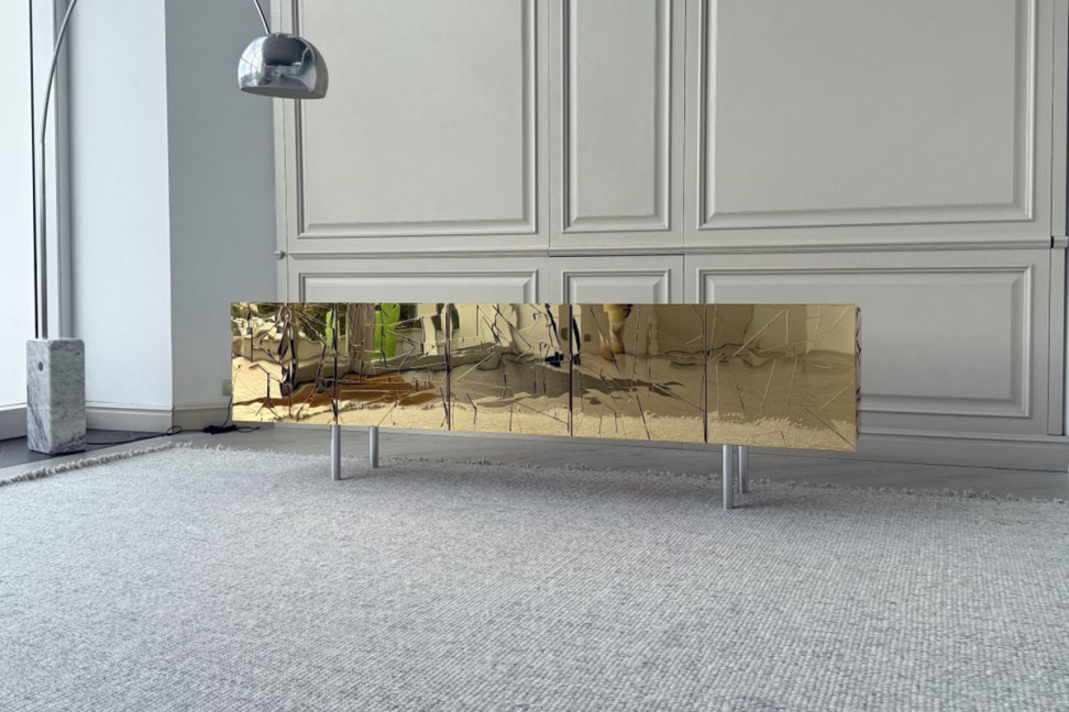 Caratteristiche Tecniche: La struttura dello Scrigno è in legno, laccata con vernici metallizzate e rivestita con sagome di metacrilato specchiato Coloreflex, tagliate al laser e applicate a mano. Le ante ad ala nascondono ripiani in legno laccato e vetro, mentre i cassetti scorrono su guide a estrazione totale. Il basamento è in acciaio con piedini regolabili; in alcune versioni sono previste gambe in alluminio spazzolato lucido.