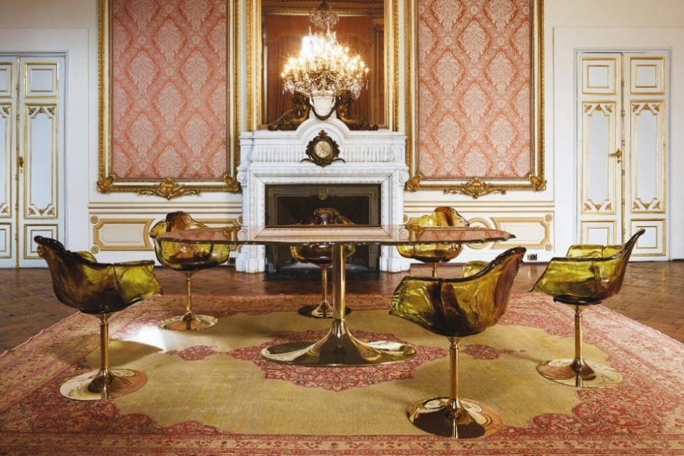 La sedia Ella viene prodotta in tre colori differenti: trasparente e sfumato verde/blu o trasparente sfumato antracite, con basamento in metallo verniciato nero semilucido; trasparente e sfumato oro con basamento in metallo in finitura 24 carati.