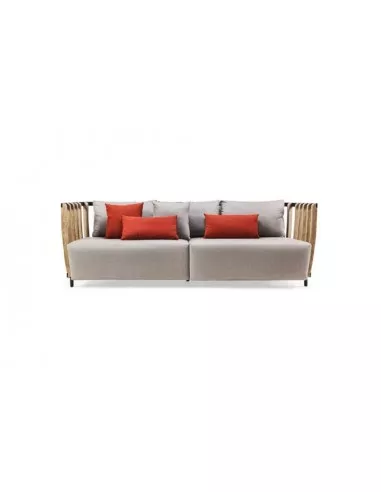 Caratteristiche Tecniche: La struttura del divano è realizzata in teak naturale o decapato, un legno pregiato che conferisce un aspetto elegante e una notevole resistenza alle condizioni atmosferiche. In combinazione con l'alluminio, scelto per la sua leggerezza e durabilità, la struttura assicura solidità e stabilità nel tempo. Il rivestimento, disponibile in tessuti di alta qualità, aggiunge un ulteriore tocco di raffinatezza.