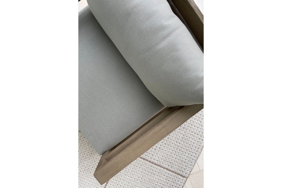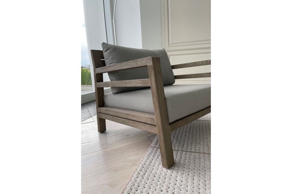 La poltrona lounge da esterno Costes in Offerta Expo presso il nostro showroom presenta una struttura in teak decapato e cuscini con tessuto da esterno in color grigio.