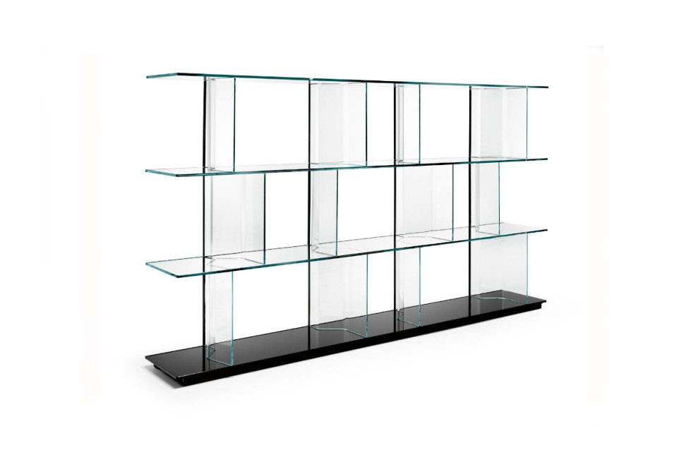Caratteristiche Tecniche: Sistema composto da elementi in vetro o legno modulari; sistema di scorrimento a binario applicato su ogni singolo ripiano, quindi tutto è liberamente posizionabile tramite sistema di ancoraggio.