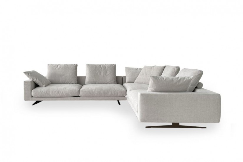 Il divano Campiello in offerta expo nel nostro showroom è una soluzione angolare, che vede l’unione di un elemento con braccioli e un elemento con bracciolo sinistro; il comfort della seduta è arricchito da quattro cuscini schienale con rullo e dagli atrettanti cuscini sfusi. Il tutto è rivestito in un elegante e versatile tessuto color grigio chiaro, abbinato a piedini in alluminio di colore bronzo.