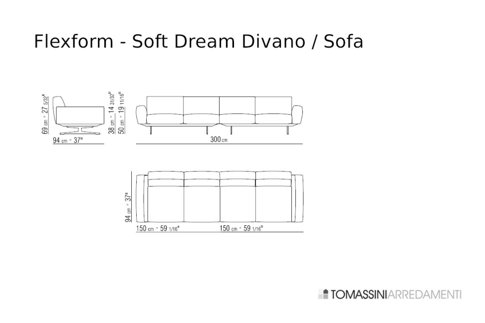 Dimensioni: cm.300x94x69h (altezza seduta: cm. 38). Composto da: