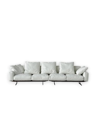 Il divano Soft Dream in offerta expo nel nostro showroom è una seduta lineare a 4 posti rivestita in pelle bianca elegante e raffinata. La struttura rivestita in cuoio di alta qualità è sottile, quasi sospesa, grazie ai piedini in metallo satinato che donano leggerezza all’insieme.