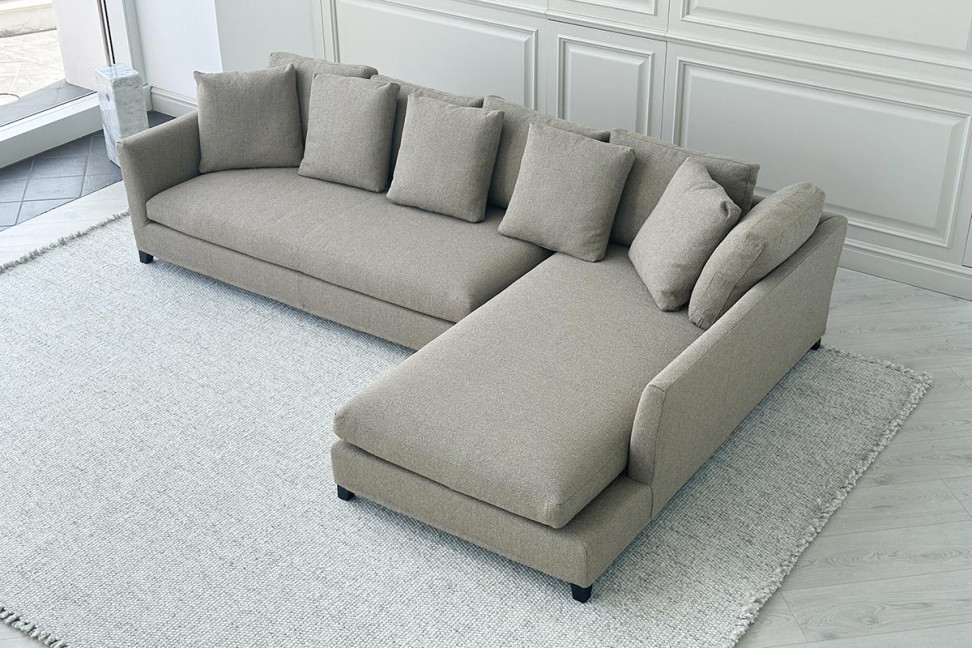 Il divano Victor Large in offerta nel nostro showroom è composto da uno spazioso modulo seduta e una confortevole chaise longue, rivestiti in morbido tessuto di un caldo tono marrone. Una serie di cuscini schienale in dotazione ne aumentano il comfort, mentre i piedi in frassino tinto ebano ne esaltano l'eleganza.