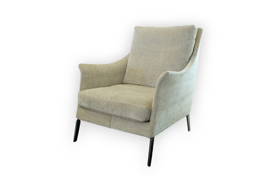 La poltrona Boss, in offerta expo nel nostro showroom, si caratterizza per lo schienale alto e avvolgente, ideale per una corretta postura, e per i leggeri braccioli. L'imbottitura è in poliuretano, mentre i cuscini sono in piuma d'oca. La struttura è in metallo brunito, in elegante contrasto con il tessuto di rivestimento, color greige, completamente sfoderabile.