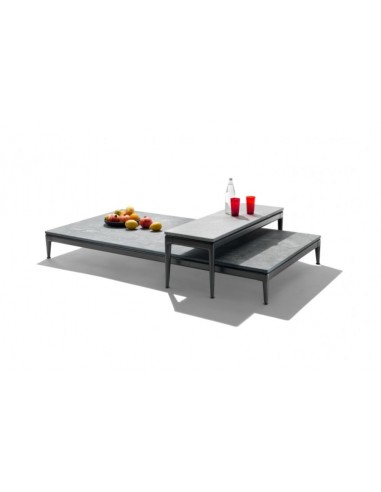 Flexform realizza il tavolino per esterno Pico con gambe in alluminio pressofuso e verniciate a polvere epossidica in diversi colori mentre il piano è disponibile in doghe in legno di iroko oppure in pietra nelle finiture Beola argentata, pietra del Cardoso, pietra lavica e porfido.