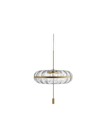 La lampada a sospensione Jolie è composta da un diffusore in vetro di Murano soffiato a bocca e da una struttura in ottone satinato che creano un equilibrato contrasto cromatico e materico. Oltre alla versione sospesa, è disponibile anche un'originale versione ad applique da parete.