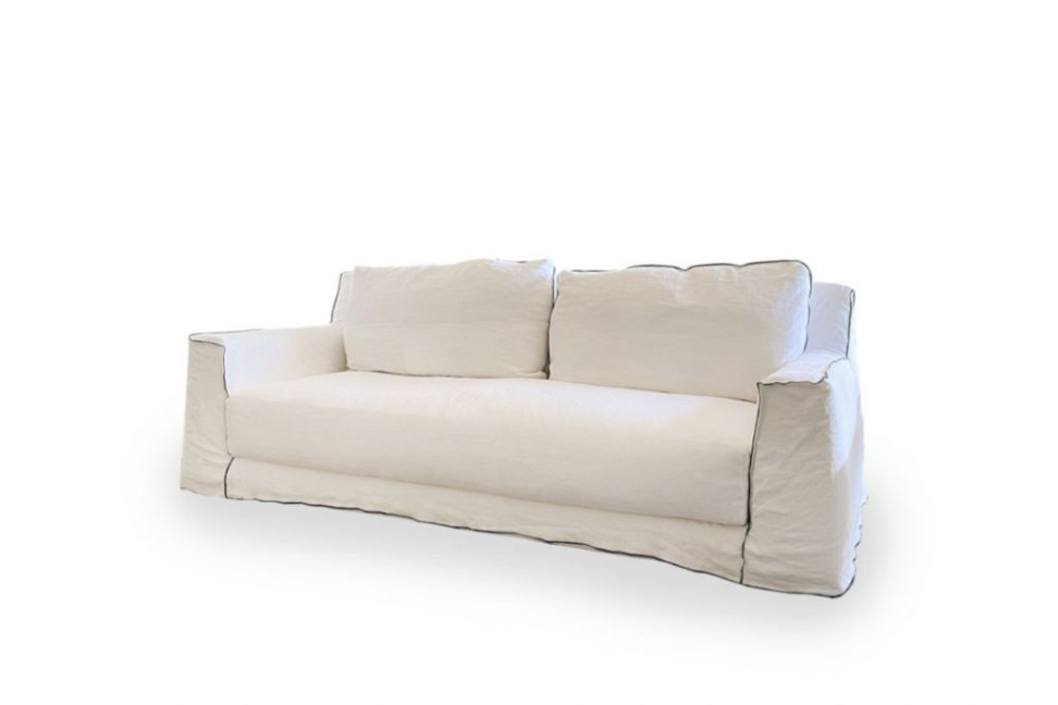Il divano Loll in offerta expo nel nostro showroom ha un rivestimento in lino bianco completamente sfoderabile con un profilo color antracite. Un abbinamento fresco, originale e al contempo elegante.