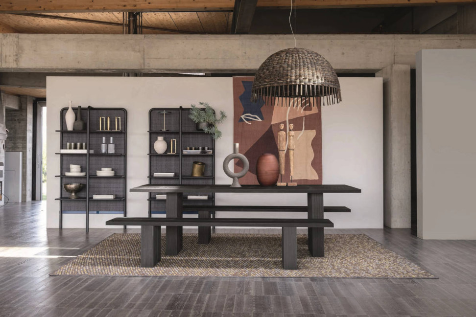 La famiglia Daen di Gervasoni, siglata da Federico Peri, cresce con l'introduzione di un nuovo elemento accanto al tavolo e alla madia, ovvero a libreria Daen.