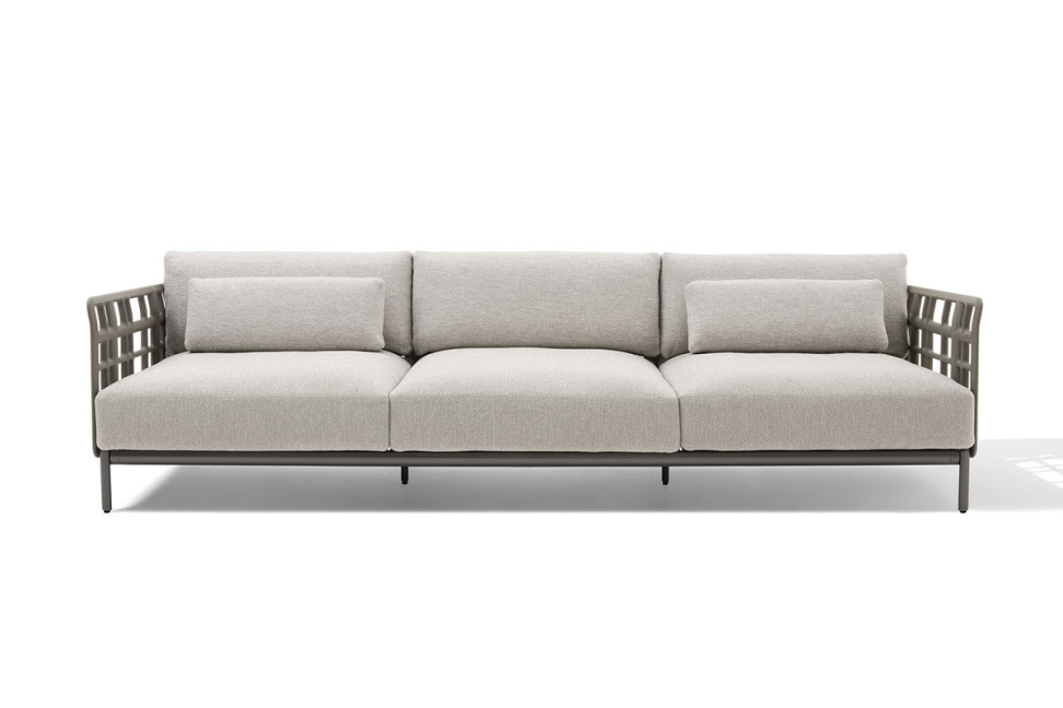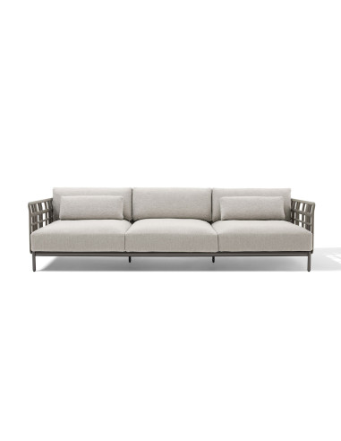 Questo divano presenta una struttura in legno stratificato che, grazie alla lavorazione attraverso macchinari a controllo numerico, sembra levigatao dal vento, per un effetto naturale sottolineato dai colori dei vari rivestimenti disponibili. Il divano per esterno Aldìa di Giorgetti presenta braccioli e schienale in multistrato di betulla e tutta la cuscinatura è rivestita con fodere waterproof.