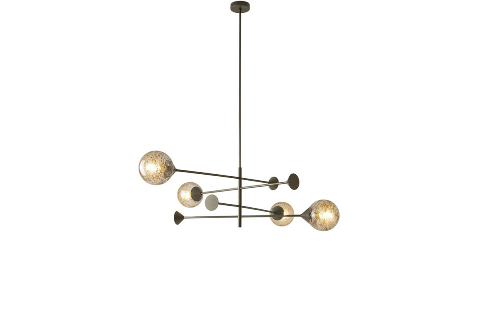 Disponibile in varie composizioni da 4 a 12 corpi luminosi, la lampada a sospensione Kendama, è costituita da una strttura in metallo brunito con sfera in vetro soffiato a bocca a scelta nei colori bronzo, ametista, grigio, ottanio e acciaio. Fanno parte della collezione anche la versione da parete con braccio inclinabile e orientabile, da terra e da tavola.
