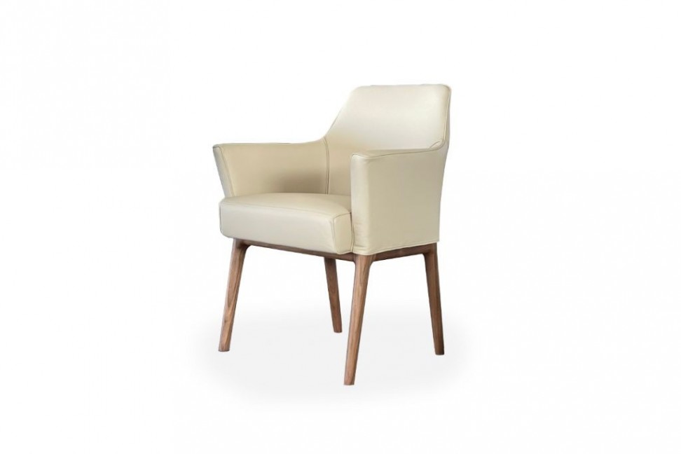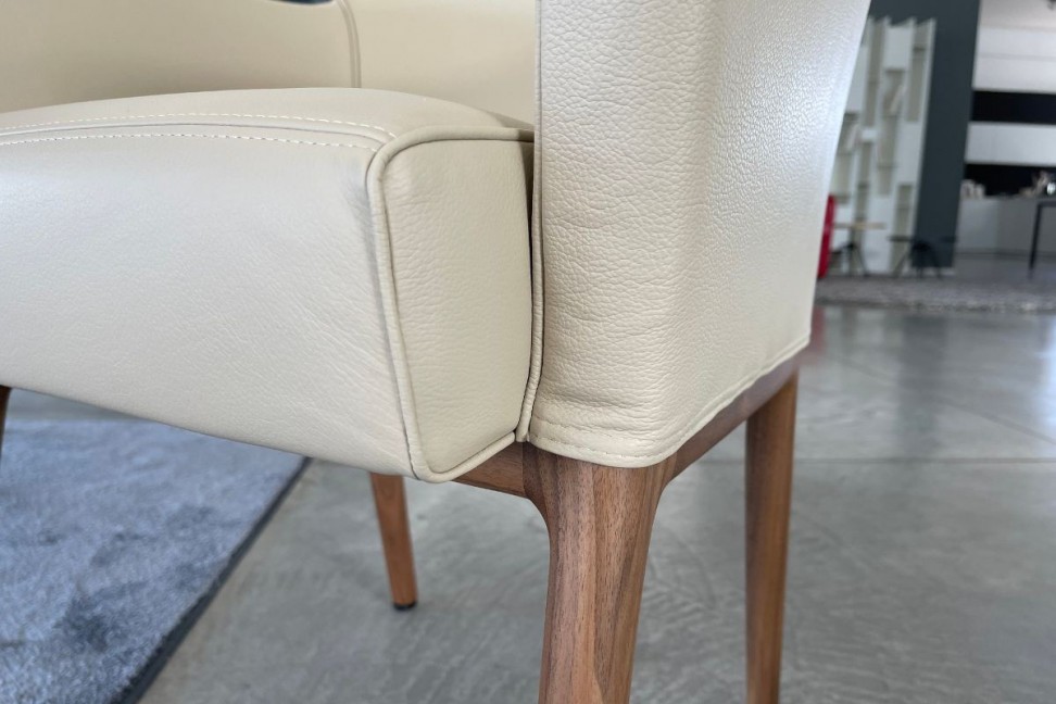 La poltroncina Alina in Offerta Expo nel nostro showroom presenta gambe in noce canaletto e rivestimento in pelle beige.