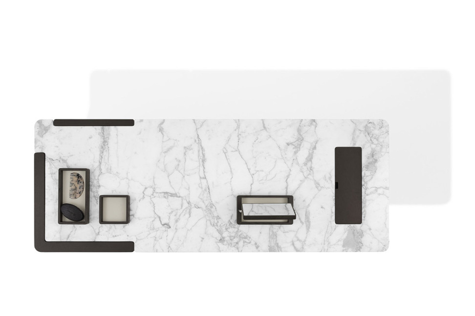 Ideato da Dainelli Studio, lo scrittoio Edward di Giorgetti è estremamente versatile in quanto può fungere sia da scrivania che da vanity. La struttura è in frassino, in viarie finiture, con la fascia centrale rivestita in pelle. Per decidere il look da dare a questa scrivania è possibile scegliere tra un piano in frassino da abbinare alla struttura o un top in marmo a scelta tra Calacatta, Calacatta viola, Portoro, Zebrino e Grigio Astratto. Inoltre, possono essere aggiunte varie personalizzazioni come la disposizione del cassetto laterale e altri accessori.