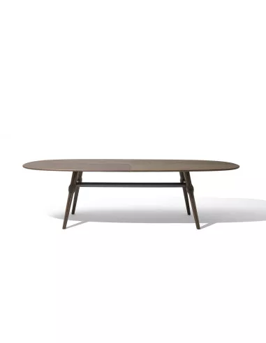 La struttura in legno dalla forma caratteristica sorregge il piano, disponibile in due versioni: in legno suddiviso in quattro parti con inserti in metallo oppure completo in marmo. Entrambe le versioni del tavolo Ago di Giorgetti offrono diverse varianti tra cui scegliere.