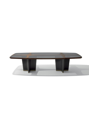 Disponibile in varie dimensioni, Bigwig di Giorgetti è composto da una base in noce canaletto con gambe rivestite in pelle e puntali verniciati color bronzo, mentre il piano è realizzato in noce canaletto arricchito, a scelta, da inserti in pelle, cristallo temperato nei colori grigio o bronzo oppure marmo nelle varianti calacatta oro, Portoro, zebrino o Velvet Brown.
