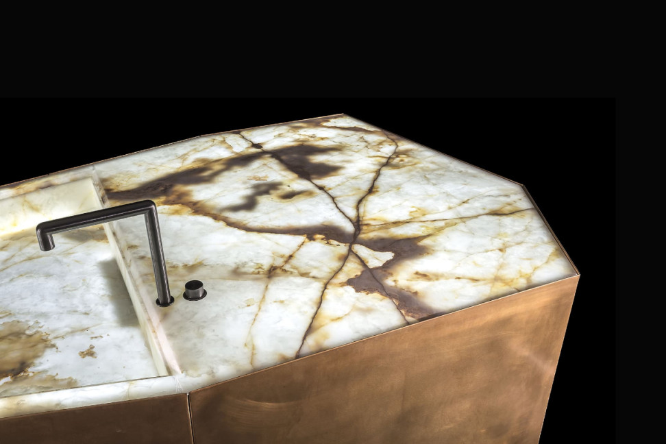 Caratteristiche Tecniche: La struttura, i cassetti e la base sono in legno massello di 2 cm di spessore, rivestiti in ottone o acciaio. I cassetti hanno una chiusura ammortizzata. Il piano di lavoro e il lavello sono in onice retroilluminato o in pietra di 2 cm di spessore.