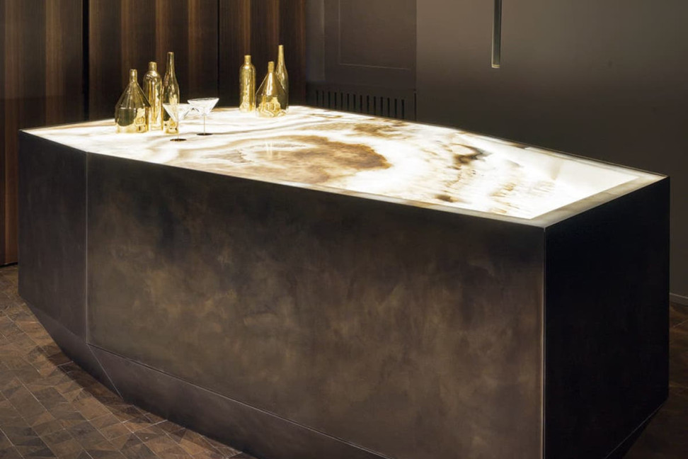 Il bancone bar Argon Evo di Massimo Castagna per Henge, presenta delle superfici in metallo con zoccolatura continua che sostengono il top in pietra retroilluminata. Anche le ampie vasche sono retroilluminate per un uso migliore del lavello e dei freezer. Gli elementi classici del bancone, come la lavastoviglie, i cassetti del frigo e la macchina del ghiaccio, possono essere nascosti.
