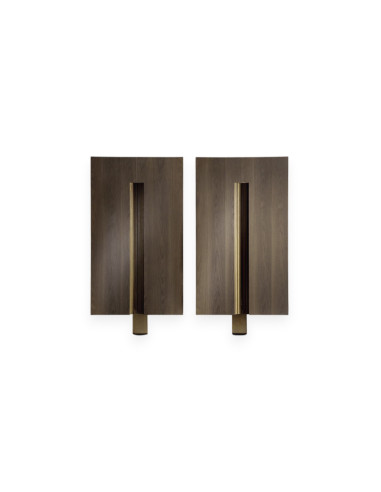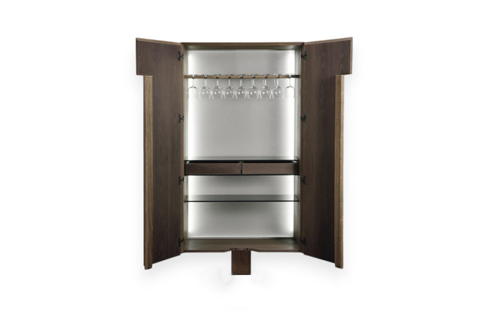 Il mobile contenitore Frame, di Massimo Castagna per Henge, è caratterizzato da una struttura in legno di rovere termo-trattato con dettagli metallici in ottone brunito a mano; il basamento è invece in acciaio con finitura in ottone brunito e i ripiani sono in vetro temperato bronzato. Il contenitore Frame è disponibile sia nella versione standard che nella versione mobile bar e può essere dotato di vassoi opzionali.