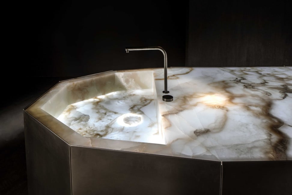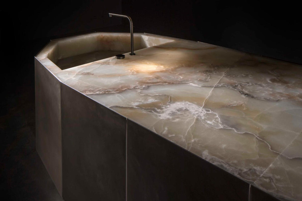 Caratteristiche Tecniche: La cucina Argon è dotata di frontali in metallo e di uno zoccolo inclinato che sostiene un piano in pietra retroilluminato. Grandi vasche retroilluminate fungono sia da lavello che da ghiacciaia. Inoltre, offre uno spazio discreto per nascondere tutti gli elettrodomestici da cucina, come la lavastoviglie, i cassetti del frigorifero e la macchina per il ghiaccio, simile a un bancone da bar. I ripiani sono realizzati in legno termizzato e le finiture disponibili includono rovere termizzato e frassino olivato di palude.