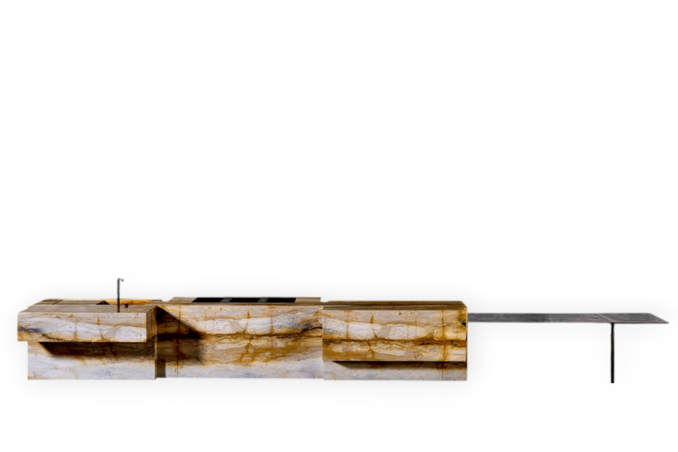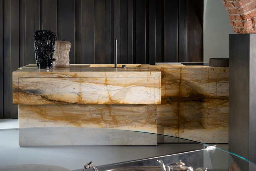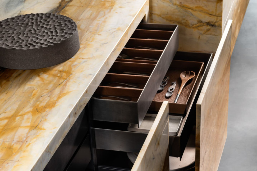 Grazie al design di Massimo Castagna e alla lavorazione artigianale di Henge, ogni cucina Opera assume un carattere esclusivo: le finiture manuali portano a variazioni nel marmo, metallo o legno, rendendo ogni prodotto unico.