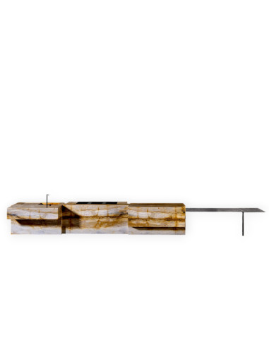 Caratteristiche Tecniche: La cucina Opera è realizzata impiegando le esclusive pietre di Henge, consultabili nel catalogo tecnico. Questo modello è ideale sia come isola autonoma che come installazione a parete. E' dotata di uno zoccolo in Acciaio Brunito Nero e offre la possibilità di aggiungere cassetti in multistrato termotrattato in finitura Rovere Thermo Wood e Frassino Olivato di Palude con apertura e chiusura ammortizzata elettricamente. Altri accessori disponibili sono: vassoi in metallo, portaposate, griglia di scarico, tagliere, cuscinetti in pelle e cestini in acciaio inox.