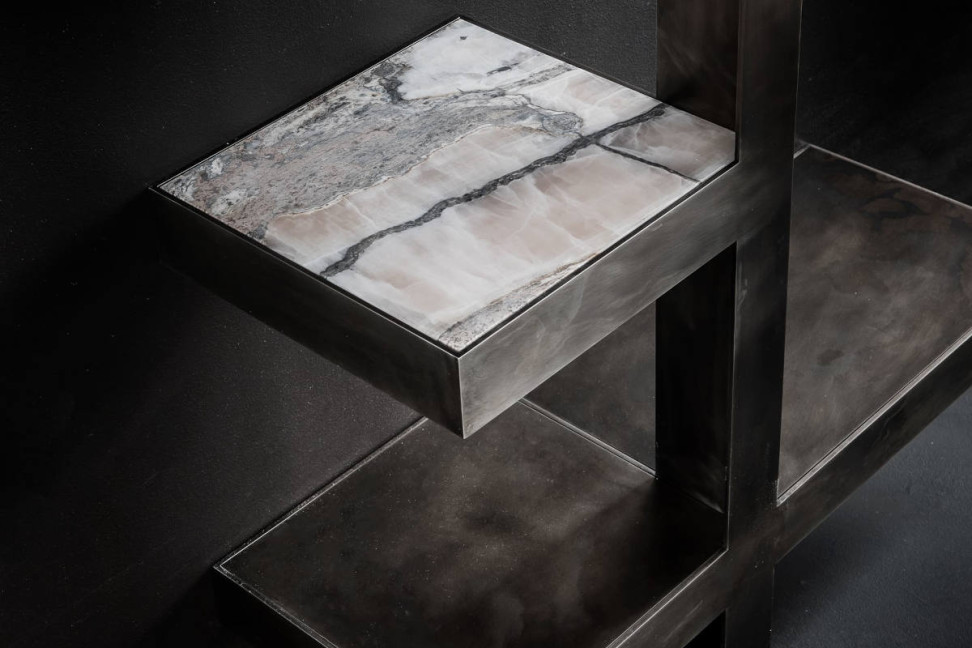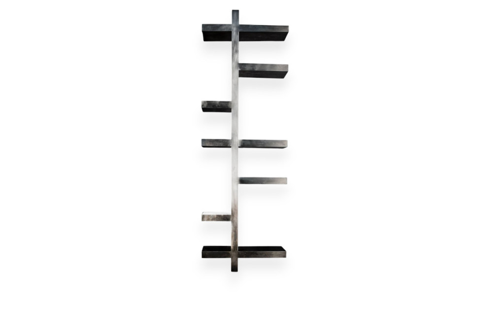 Il designer Massimo Castagna ha ideato questa libreria per Henge, quasi fosse un'opera d'arte. Troviamo accostamenti di materiali diversi – legno, metallo e pietra – che creano un prodotto estremamente elegante, secondo gli standard di Henge. Questa libreria è caratterizzata da linee semplice e asimmetriche che donano dinamicità alla composizione. La struttura principale è disponibile in Platino o Titanio brunito, mentre gli inserti delle mensole possono essere in legno o pietra.