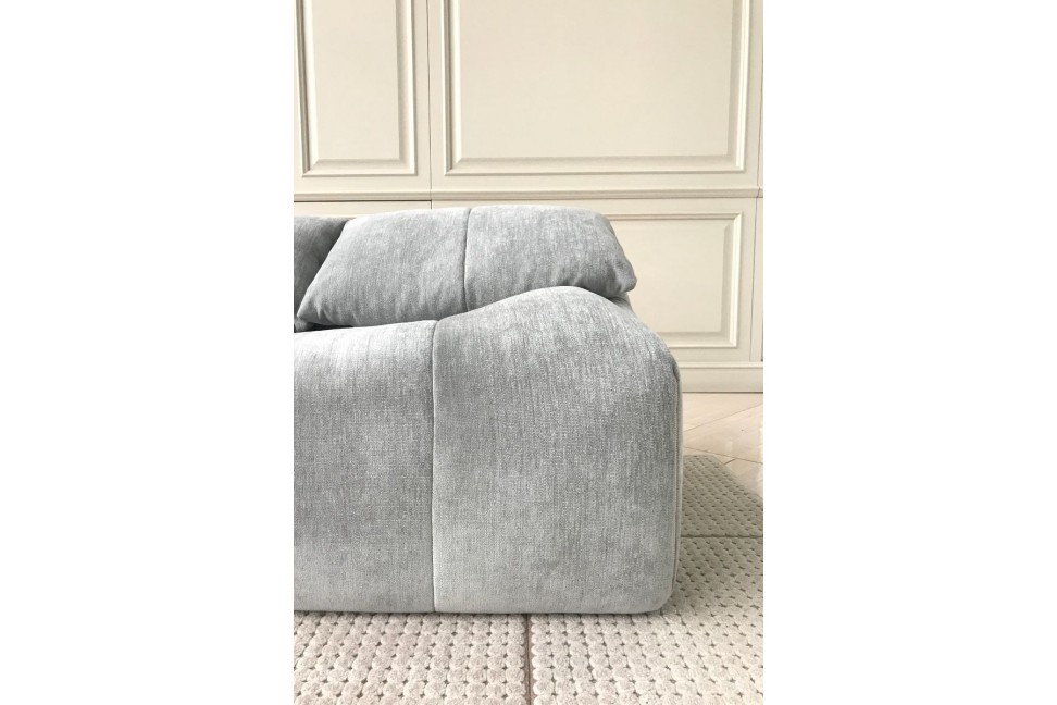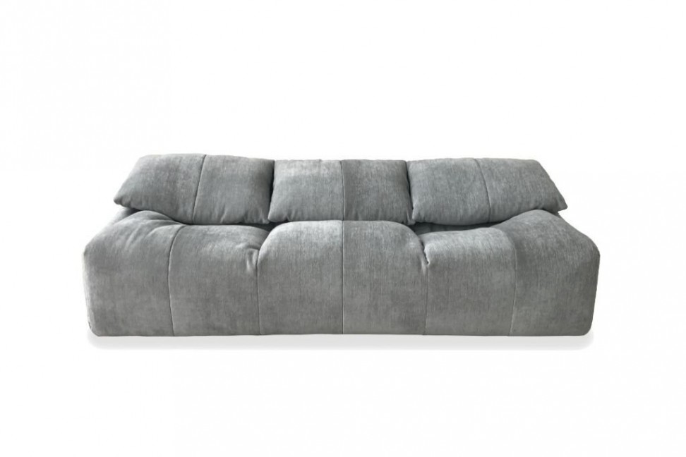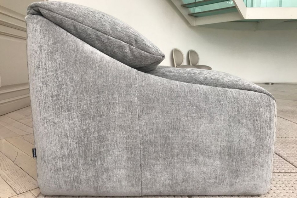 Il divano Plumy in Offerta Expo presso il nostro showroom presenta un rivestimento in tessuto color grigio con chiusure lampo color grigio perla.