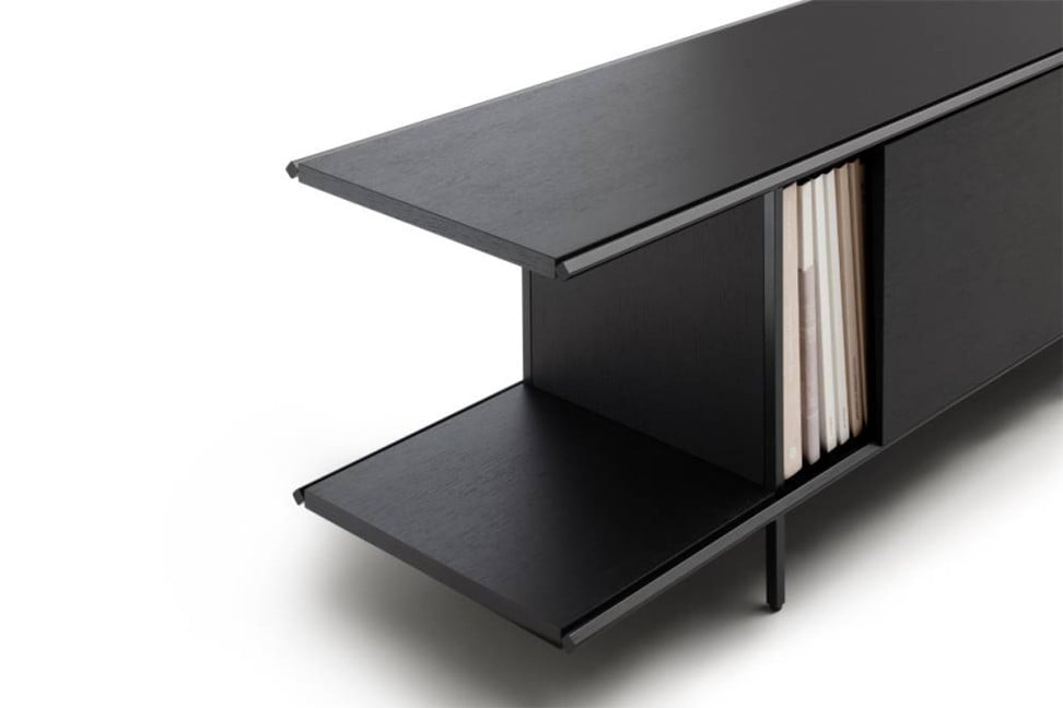 Per quanto riguarda le finiture, il mobile contenitore Railway offre una vasta gamma di opzioni. Gli elementi sono impiallacciati in rovere tinto carbone, tranciato di legno multilaminare Striped Grey o Stone Oak®, consentendo di scegliere una finitura che si adatti al proprio stile e alle altre componenti dell'arredamento circostante. L'anta del mobile è realizzata in MDF, con bordi superiore e inferiore sagomati a V. È possibile optare per un impiallacciatura nella stessa finitura del resto del mobile o una laccatura lucida in diverse tonalità, come il bianco crema, il rosso vino, il grigio pietra o il grigio quarzo. Questa versatilità di scelta consente di personalizzare il mobile in base ai gusti e alle esigenze estetiche individuali. Railway è dotato di gambe in alluminio verniciate con una finitura epossidica nero ANODIK. Queste gambe conferiscono al mobile una base solida e stabile, assicurando un supporto affidabile per tutto il suo contenuto. Inoltre, i piedini regolabili con cappuccio in PVC nero consentono di compensare eventuali dislivelli del pavimento e di mantenere il mobile perfettamente stabile e bilanciato.
