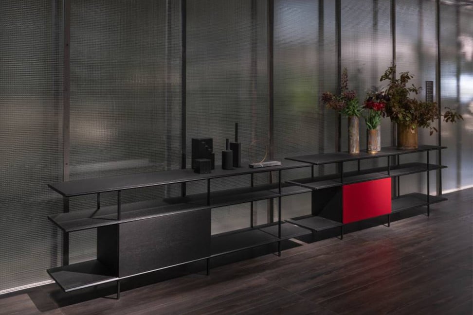 La caratteristica distintiva del mobile contenitore Railway è l'equilibrio tra elementi a giorno e vani chiusi. Questa combinazione offre la possibilità di esporre oggetti decorativi e di valore sui ripiani a giorno, mentre gli oggetti meno esteticamente gradevoli o più delicati possono essere riposti nei vani chiusi, mantenendo così un aspetto ordinato e organizzato. La progettazione di Giacomo Moor si distingue per la sua attenzione ai dettagli e la ricerca di soluzioni tecniche raffinate. Nonostante la sua forma semplice ed essenziale, il mobile nasconde un sistema di montaggio sofisticato che garantisce il perfetto parallelismo tra i ripiani e gestisce l'incontro tra montanti e traversi.