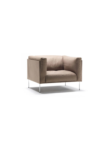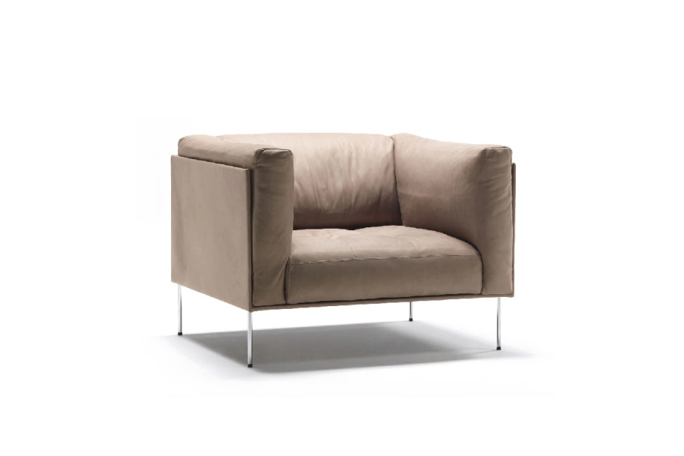 La poltrona Rod racchiudendo nella sottile scocca i soffici cuscini (in piuma d'oca e inserto in poliuretano espanso), sembra avvolgere chi si siede come in un abbraccio a cui abbandonarsi.
