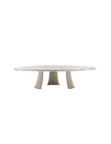 Il tavolo Damien, siglato Giuseppe Viganò e realizzato da Longhi, è disponibile in versione ovale, circolare e rettangolare, ed è caratterizzato da un elegante piano disponibile sia in specchio bronzo o fumè che in un'ampia gamma di marmi pregiati. Il sottopiano è invece in metallo ed è sostenuto da tre gambe rivestite in pelle, che ne slanciano la figura. Per la versione circolare è disponibile un piano girevole coordinato.