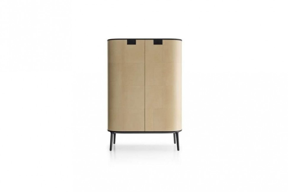 Disponibile in tre diversi modelli di varie altezze, il contenitore Tesaurus presenta una base in metallo con una struttura in legno impiallacciato e ante a battente rivestite in legno o in pergamena, mentre il piano superiore è realizzato in marmo. L'interno è equipaggiato con ripiani e vani che vanno incontro ad ogni tipo di esigenza pratica.