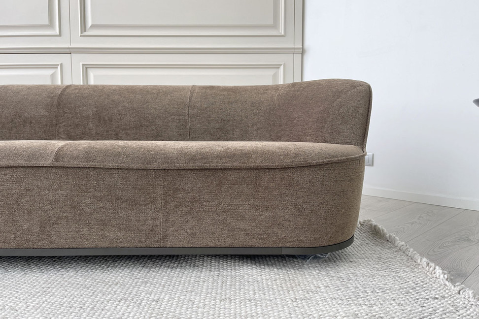 Il Divano Lilum in offerta expo nel nostro showroom è dotato di un rivestimento in tessuto color marrone, con base verniciata cromata di colore nero.