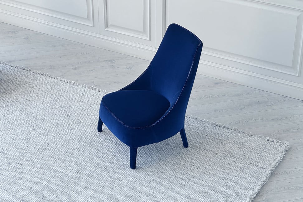La poltrona bergère Febo in offerta expo nel nostro showroom è rivestita con tessuto in morbido velluto dal colore blu intenso, che ne risalta l'eleganza. In questa versione anche le gambe sono interamente rivestite in tessuto, mentre le linee sinuose dello schienale e della seduta sono messe in evidenza dalla cucitura a contrasto con punto cavallo in filo di colore grigio perla.